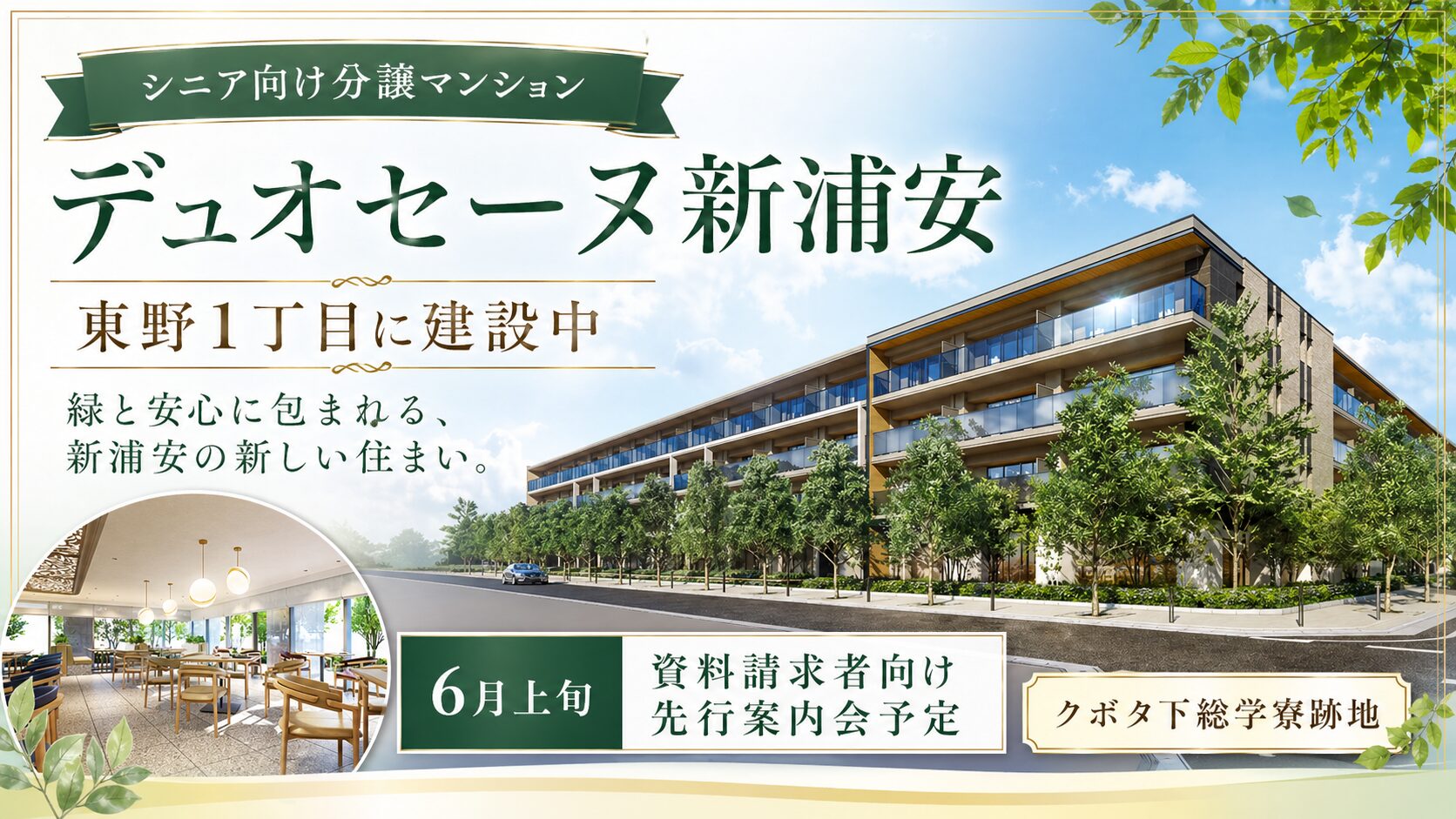 浦安市東野1丁目のクボタ研修施設(クボタ下総学寮)の跡地で工事が進んでおり、シニア向け分譲マンション「デュオセーヌ新浦安」が建設中であることがわかりました。2026年6月上旬に資料請求者向け先行案内会の開催が予定されています。