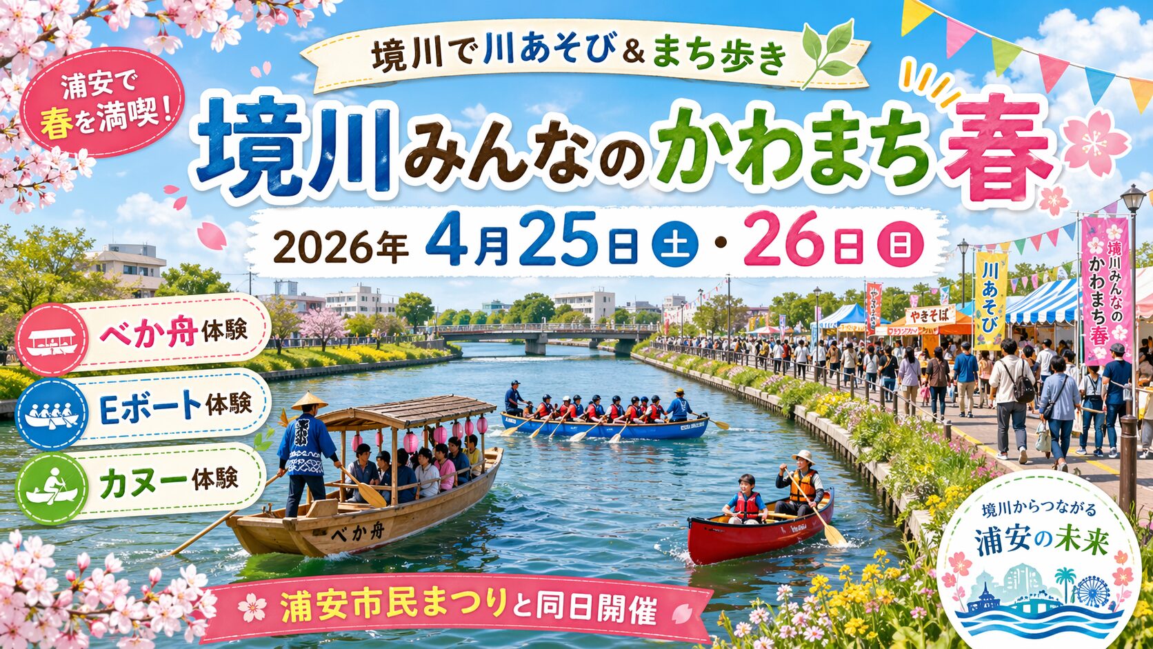 浦安市の境川沿いで、2026年4月25日(土)・26日(日)に「境川みんなのかわまち春」が開催されます。第28回浦安市民まつりと同日・同エリアでの開催となり、川に親しめるさまざまな体験が楽しめるイベントです。